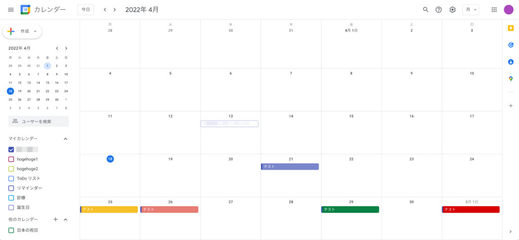 例えばですが、ログインしている状態でのGoogle Calendar(上)は右クリックなどで変更した帯色のままで表示されますが、共有すると下記の「テストカレンダー1」のように1色で表示されます。