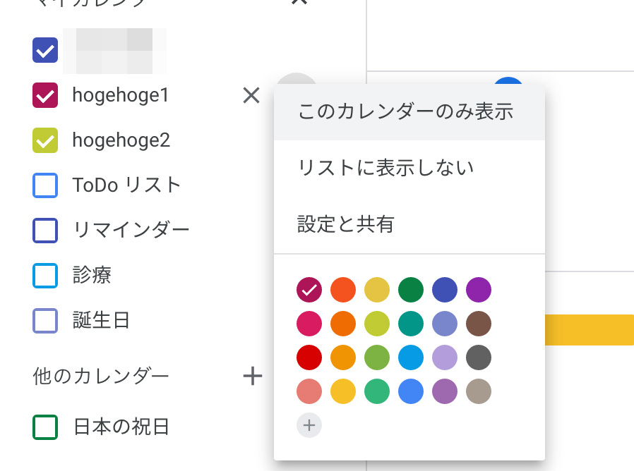 帯色を変更したい場合は、カレンダー名にマウスカーソルを重ねるとメニューアイコンが表示されますので、そちらをクリックすると下記の画像のように設定することが可能です。